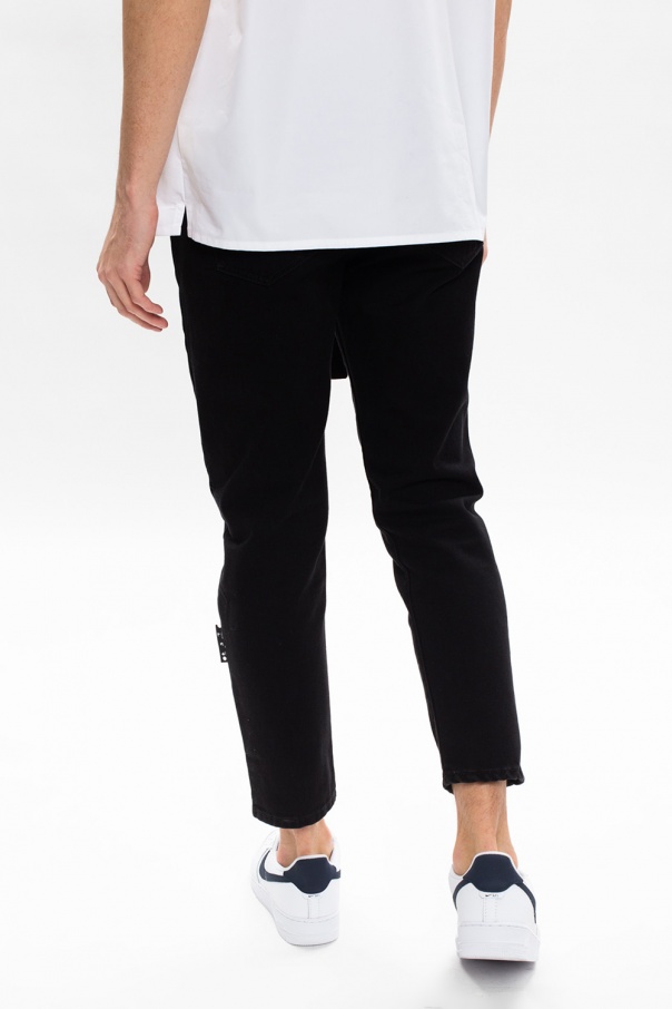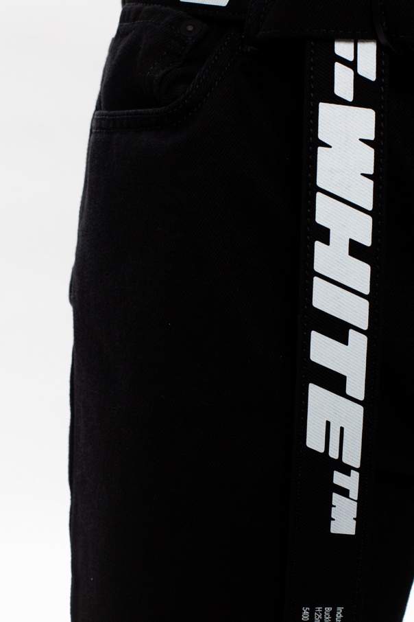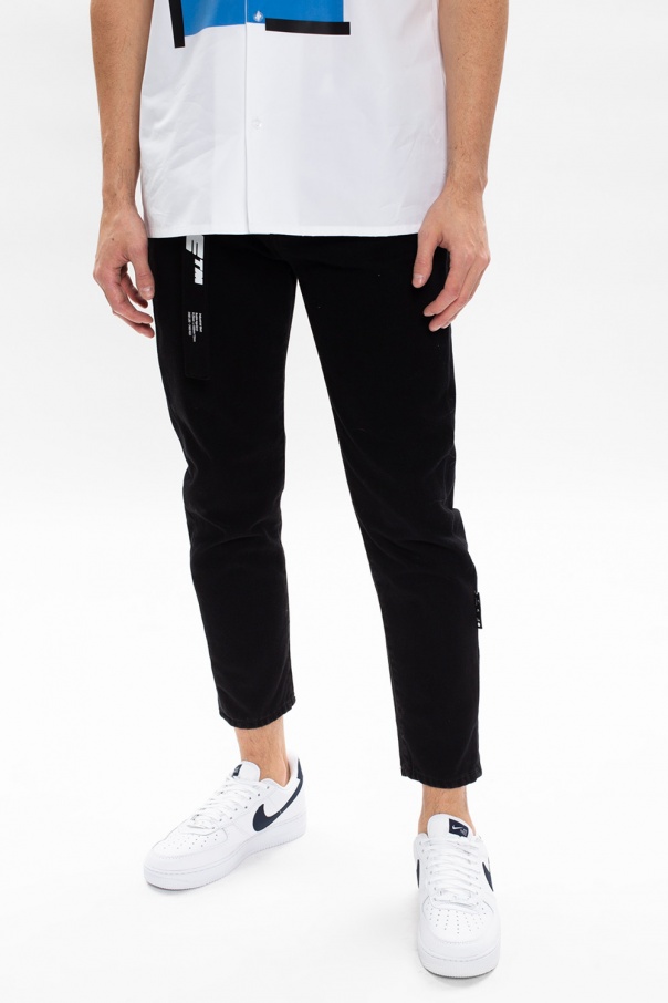 Black jeans from Off-White. Fastened with a button and zip fly, this tapered leg design is complete with two slip pockets, two back pockets and a removable belt printed with a logo pattern in white.