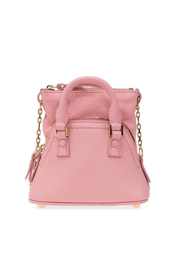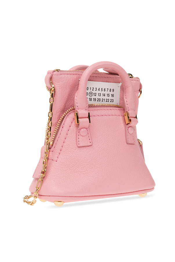 Pink ‘5AC Baby’ shoulder bag from Maison Margiela. Made of leather, this design secures with a zip and showcases the brand\'s signature white logo patch on the front. It is complete with a long gold and leather shoulder strap, two half-round handles, gold-tone metal hardware and one internal compartment.
