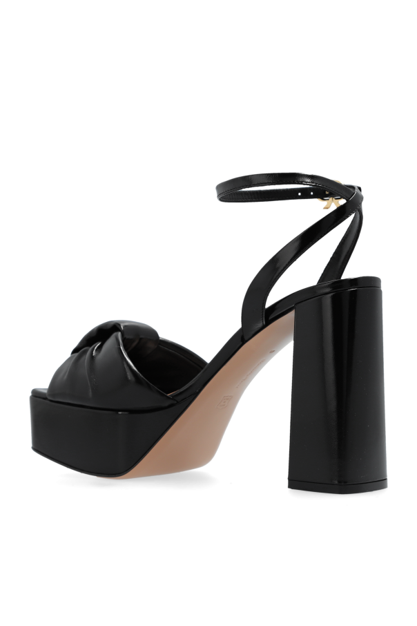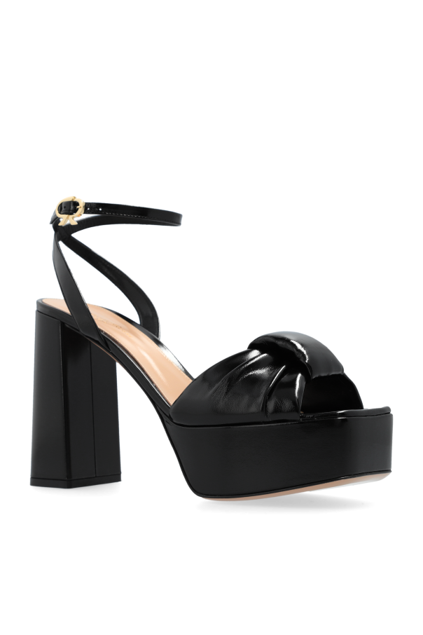Introducing the Paradi Platform Sandals, an exquisite creation from the renowned designer Gianvito Rossi. These sandals are a testament to opulence, crafted from lustrous black leather that exudes sophistication. The high, chunky block heel and platform design provide not only added height but also remarkable stability. The front of the sandal features an elegant, overlapping pattern, enhancing its refined aesthetic. A slender, adjustable ankle strap with a delicate gold buckle ensures a secure fit. The interior of the sandal is lined with soft beige leather, offering exceptional comfort for prolonged wear. The light brown sole complements the overall design, adding a subtle yet stylish contrast. Adding to its allure, the sandals boast a golden designer logo on the insole, affirming their exclusive nature. The rectangular heel construction further augments stability, making them a perfect choice for any special occasion. Why Choose This Product? Luxurious black leather for a sophisticated look Chunky block heel and platform for added height and stability Elegant overlapping front design Adjustable ankle strap with gold buckle Comfortable beige leather interior Exclusive with a designer logo on the insole Rectangular heel for enhanced stability