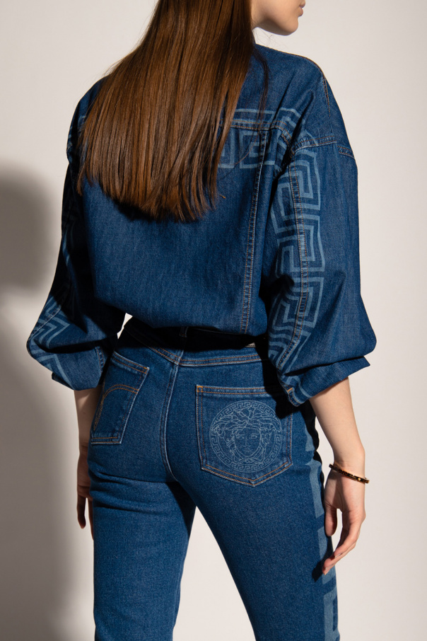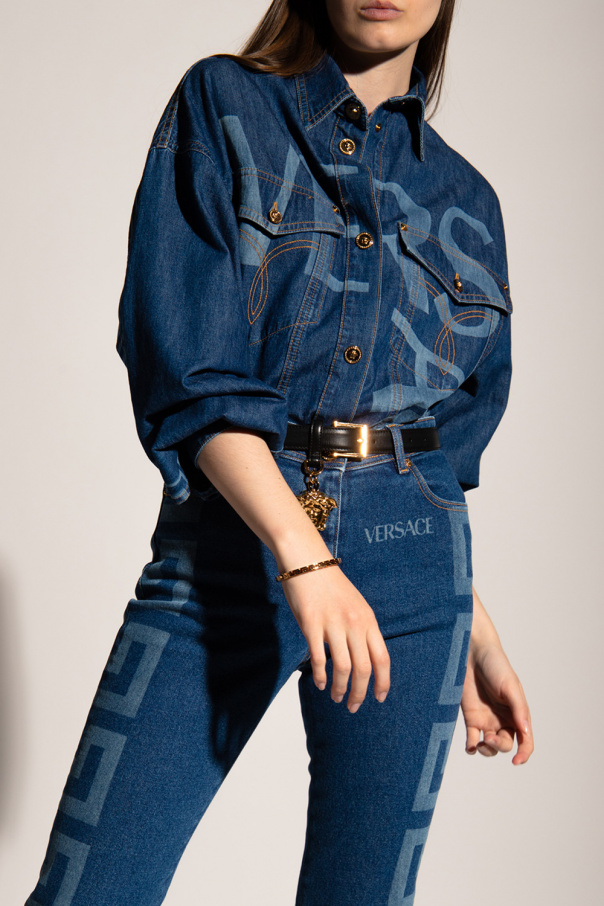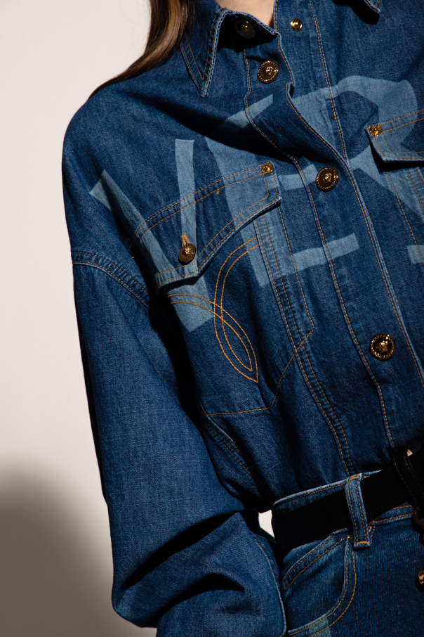 Blue denim shirt from Versace. Printed with the brand\'s logo, this style features decorative snap closures, two flapped pockets with buttons and gold-tone metal hardware.