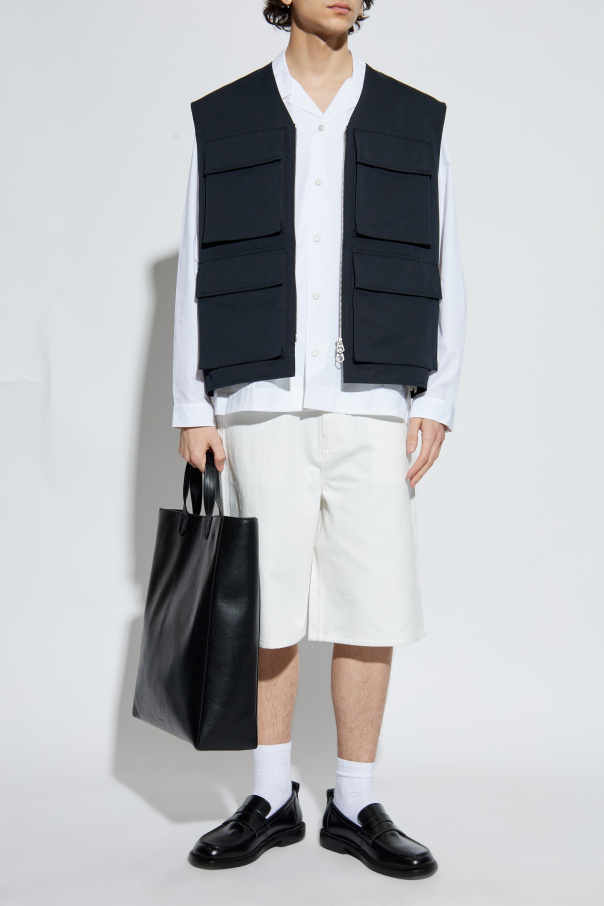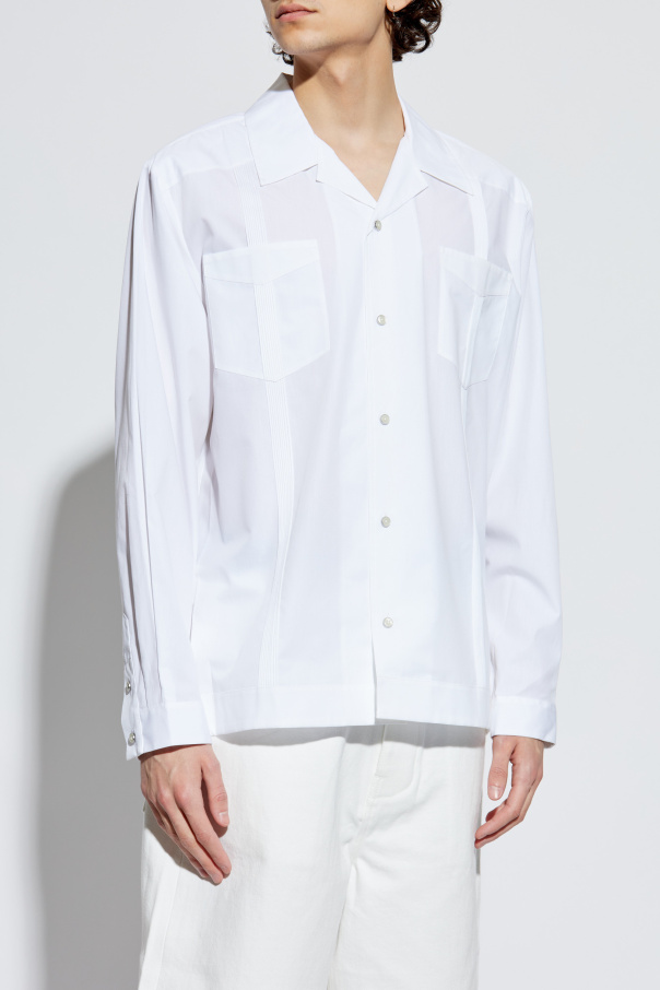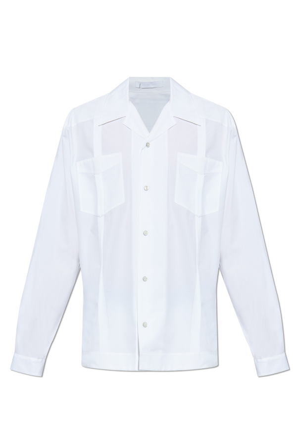 Introducing the Helmut Lang Pocket Shirt, a masterpiece from the illustrious Austrian marque, renowned for its minimalist yet sophisticated design ethos. This pristine white shirt epitomizes the brand\'s legacy, marrying elegance with a casual allure. Crafted from the finest quality cotton, this shirt features a classic, straight cut with long sleeves and a structured collar with laid-back lapels, exuding an air of refined sophistication. Adorned with two chest pockets, the shirt boasts a full-length button closure, harmoniously integrating delicate stripe patterns on the pockets and impeccably matched white buttons, ensuring a cohesive aesthetic. The lightweight fabric imparts a contemporary and fresh character, making it an indispensable piece for both formal and everyday ensembles. Why Choose This Product? Exquisite craftsmanship from Helmut Lang\'s exclusive collection. Versatile design suitable for both formal and casual occasions. Elegant details with subtle patterns enhancing its uniqueness. Premium cotton material offering comfort and breathability.
