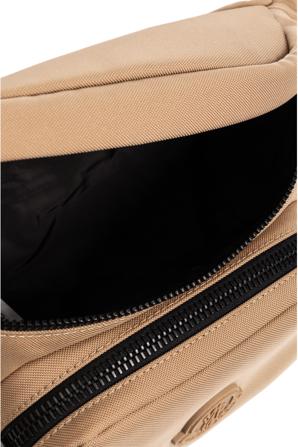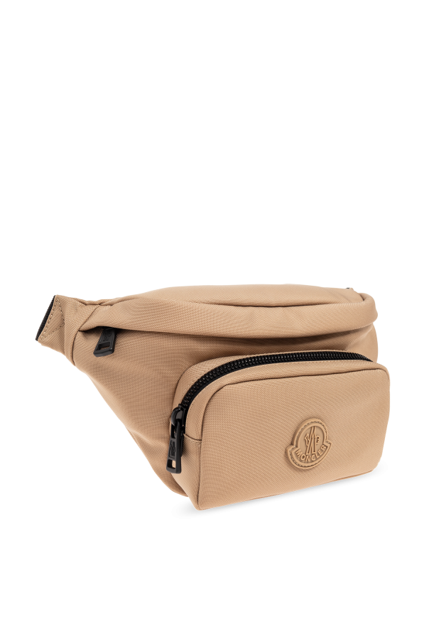 Beige ‘Durance’ belt bag from Moncler. Made from waterproof material, this design fastens via a zip and showcases a rubber logo patch accompanied by a zip pocket on the front, one zip pocket on the back, black metal hardware as well as an adjustable strap and one internal compartment.