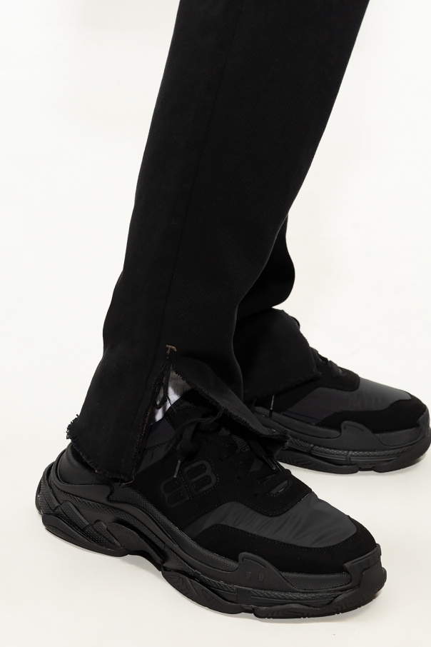 Black slim fit jeans from Balenciaga. Fastened with a zip and button, this pair features a logo patch at the back, three front pockets, two back pockets, vintage effect and long sleeves with slits.