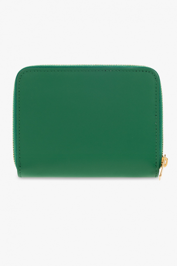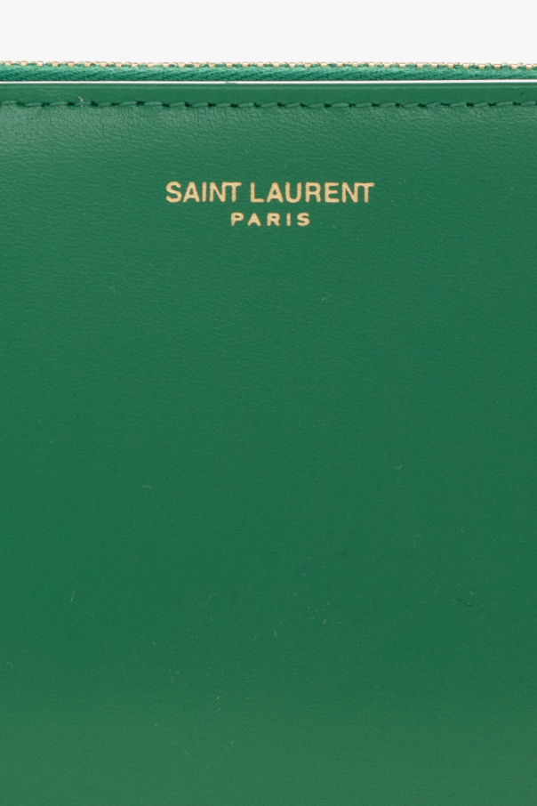 Green bifold wallet from Saint Laurent. Made of calf leather, this item features a snap closure, gold-tone logo print and zipped coin pocket. It has one bill compartment, four slip pockets and six card slots.