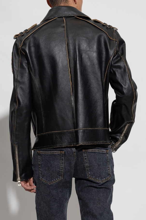 Black jacket from Balmain. Made of cow leather with distressed detailing, this style features a zip fastening, applications with gold-tone and silver-tone studs, four zip pockets and long sleeves.