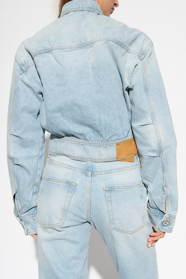 Blue denim jacket from Off-White. Fitted at the waist and relaxed on the shoulders, this style features button fastenings, two flapped pockets with buttons, long sleeves with button cuffs and a brown suede patch with an embossed logo at the back.