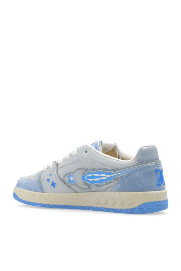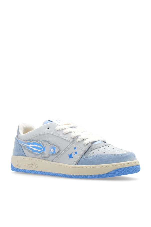 Grey and blue ‘EJ Egg Rocket’ sneakers from Enterprise Japan. Made of leather and fabric, this lace-up model sits on a cream and blue rubber sole and showcases a patch, perforations on the front as well as a raw-trimmed tongue and an embroidered logo pattern.