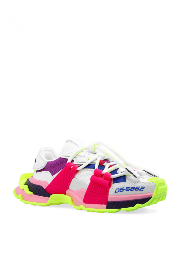 Multicolored ‘Space’ sneakers from Dolce & Gabbana. Crafted from contrasting fabrics with rubber appliqués, this lace-up pair features a raised logo detail, laces with a neon yellow logo and multicolored 3D sole made of flexible rubber.