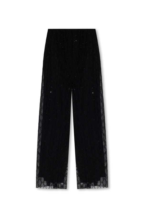 Black trousers from Gucci. Crafted from a crystal-bejewelled GG stretch nylon tulle, this pair falls with wide, loose-fitting legs and features an elasticated waistband and a detachable lining.