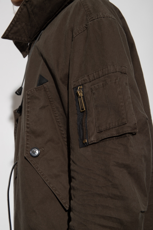 Dark green parka from Dsquared2. Crafted rom cotton, this style secures with a two-way zipper and snaps and features a drawcord-adjustable hood and hem, two flapped pockets with buttons, a single back vent and long sleeves – one has two slip pockets and one zip pocket.