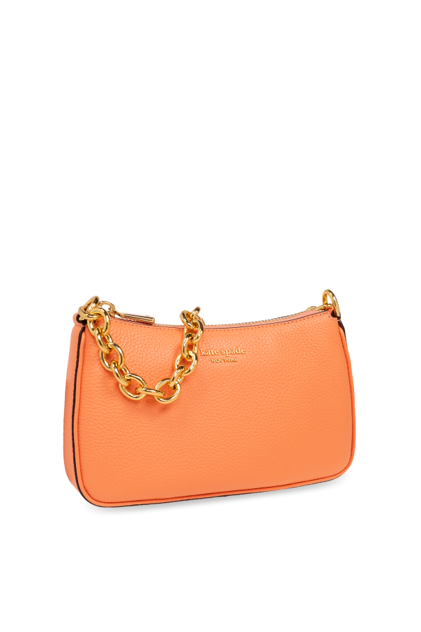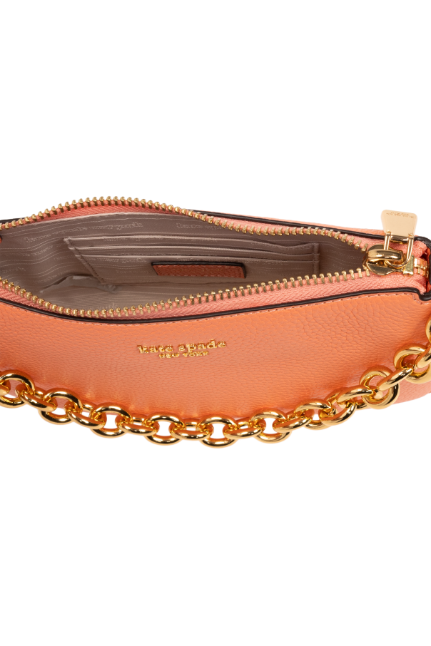 Introducing the ‘Jolie’ Shoulder Bag by Kate Spade—a quintessence of feminine style and practicality. Crafted from premium leather with a delicate texture, this bag presents an exquisite accessory that elevates any ensemble. Its vibrant orange hue, complemented by a sophisticated gold chain handle, sets a bold fashion statement. The bag’s crescent shape and discreet designer logo on the front add a touch of elegance, while the adjustable strap at the back offers versatile wearing options. The interior of the bag, lined with a material in a darker shade, features a convenient pocket and three card slots, ensuring your essentials are organized and within reach. Enhanced by a color-coordinated zipper closure, the ‘Jolie’ bag blends functionality with chic design, making it an impeccable addition to your accessory collection. Why Purchase This Product? Versatile Elegance: The unique crescent shape and orange color offer a statement piece that complements various outfits. Quality Material: Made from 100% leather with a subtle texture, promising durability and a luxurious feel. Functional Design: Features an adjustable strap, a gold chain handle, and interior compartments for optimal organization. Designer Craftsmanship: A discreet but clear logo signifies the distinguished design and quality of Kate Spade.