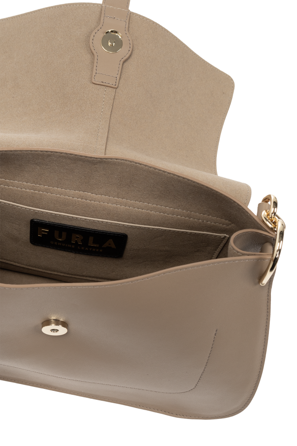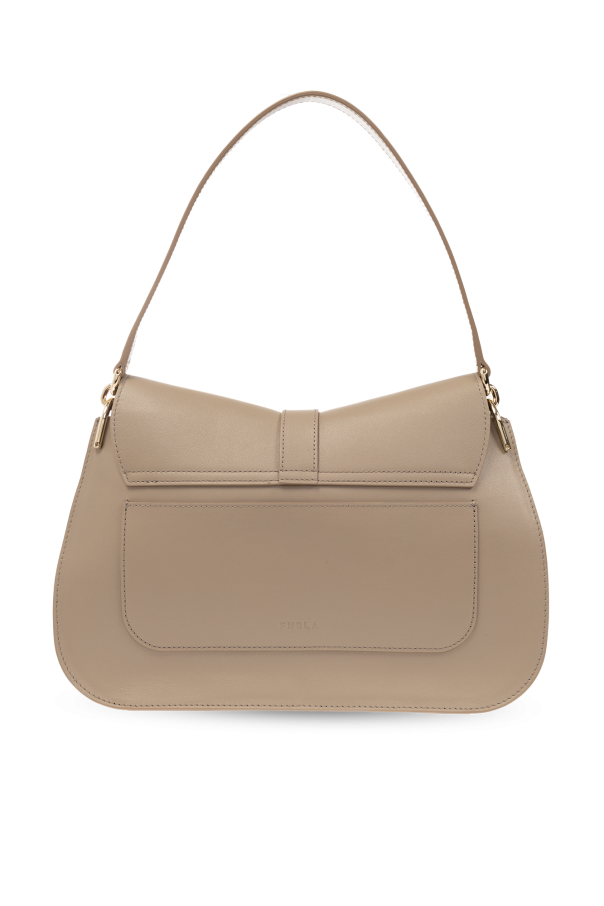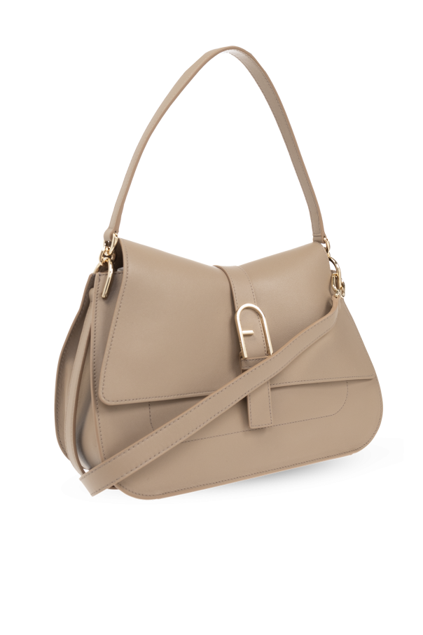 Greyish beige ‘Flow Large’ shoulder bag from Furla. Made of leather, this design features a magnetic closure, logo detail on the front, one back pocket, short strap, detachable and adjustable shoulder strap, gold-tone metal hardware and one internal compartment with one slip pocket.