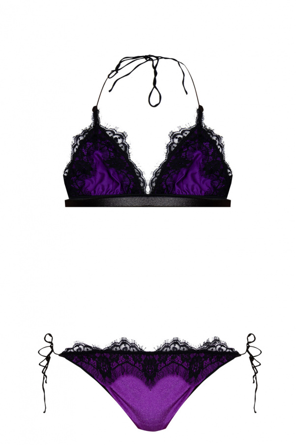 Purple ‘Travaille’ two-piece swimsuit from Oseree. Trimmed with black lace, this style features tie fastenings.
