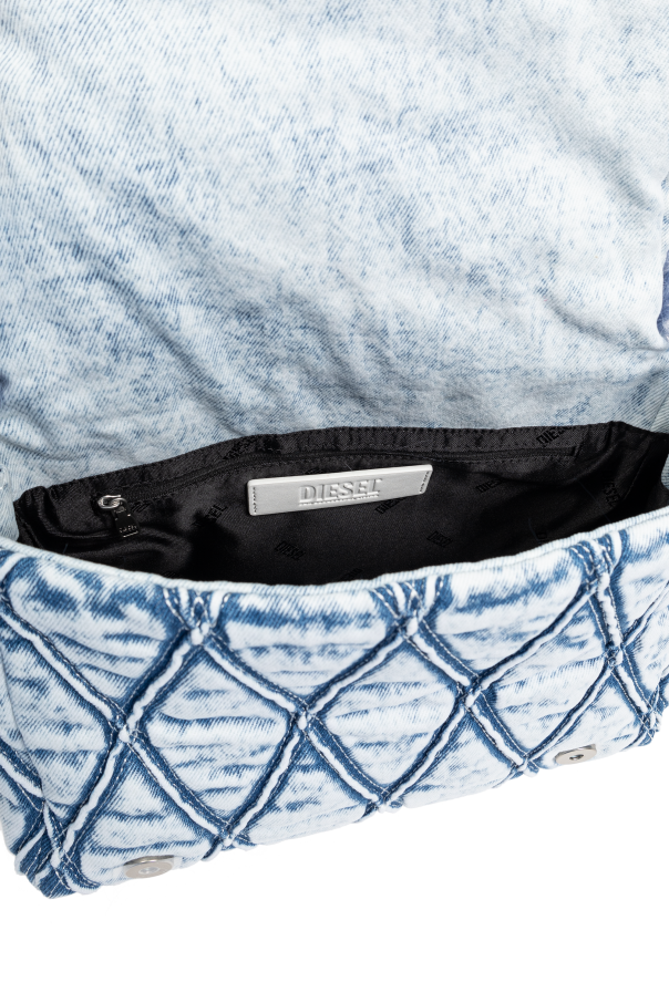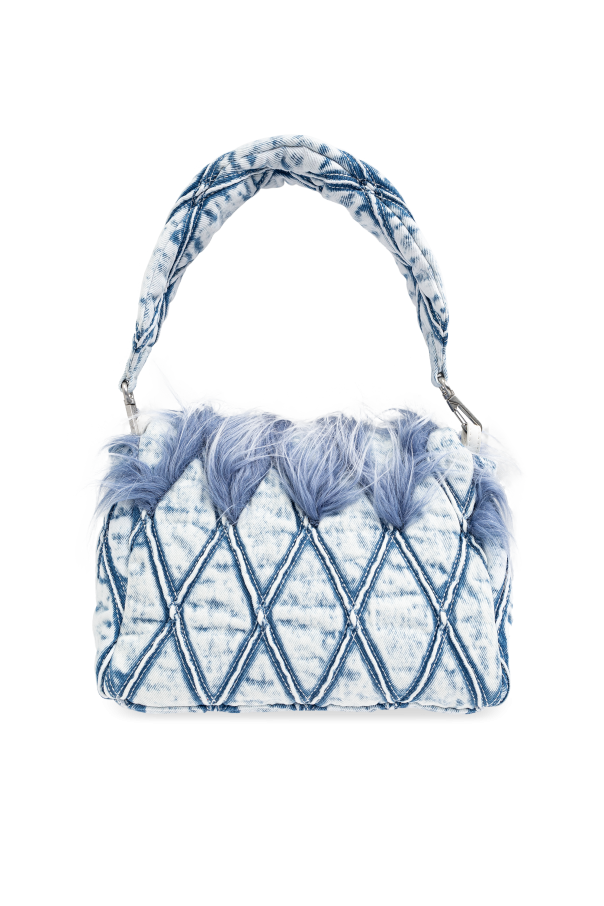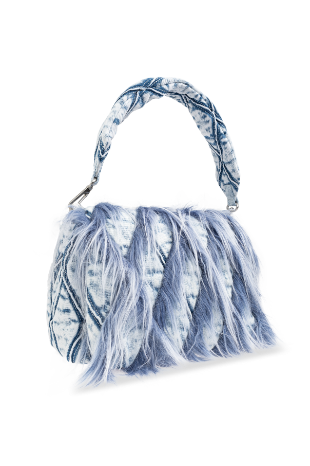Introducing the CHARM-D shoulder bag, an exquisite piece from the exclusive collection by Diesel. This bag epitomizes elegance and functionality with its classic rectangular shape and unique artistic pattern, crafted from bold ribbed denim in shades of blue, adorned with intricate stitches forming diamonds and triangles. Made from a luxurious blend of materials, the bag features a striking long, plush fur exterior in varying blue hues, imparting a sophisticated and opulent appearance. The handle, crafted from the same material as the bag\'s body, ensures a seamless and cohesive design. The interior is lined with a black fabric emblazoned with the designer\'s logo, exuding a touch of class and brand authenticity. A silver bracelet spelling \"DIESEL\" subtly hints at the prestigious brand. The dominant blue color palette, complemented by the fur and denim, makes this bag an eye-catching accessory. Practicality meets luxury in the CHARM-D, with its spacious interior, magnetic closure, and an additional zippered pocket for secure storage. Combining modernity with exclusivity, this shoulder bag is the ideal companion for any sophisticated wardrobe. Why Choose This Product? Exclusive and artistic denim design with unique stitching. Luxurious plush fur exterior for a sophisticated look. Spacious interior with practical magnetic closure and zippered pocket. Seamless design with a matching handle. Authentic Diesel branding for guaranteed quality and style.