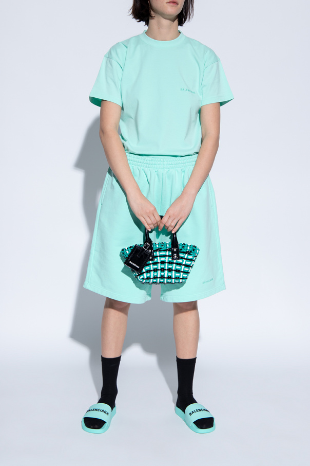 Green ‘Pool’ slide from Balenciaga. Resting on a green rubber sole, this pair is decorated with a black logo applique.
