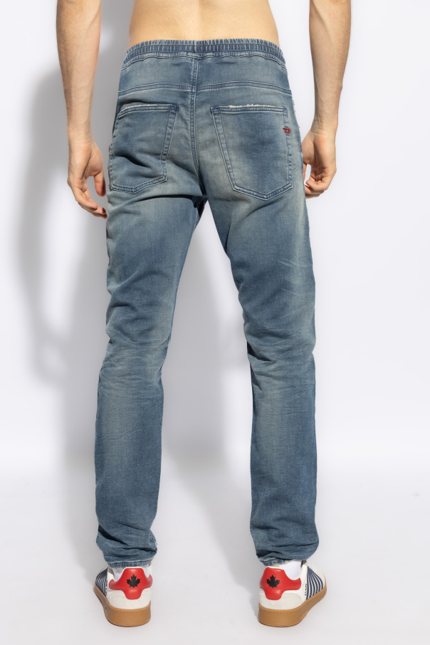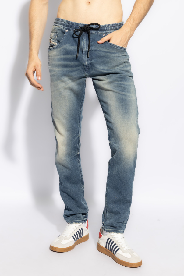 Introducing the Diesel 2030 D-KROOLEY Jeans, a quintessence of casual elegance blended with a sporty allure. These jeans are meticulously crafted from a high-quality denim, boasting a spectrum of blue hues, achieved through a sophisticated stonewash process that lends them a modern, worn look without compromising their pristine condition. Designed for the discerning man, the D-KROOLEY jeans feature a relaxed fit that ensures comfort without sacrificing style. The straight-leg design is complemented by an elastic waistband, complete with drawstrings for an adjustable fit, seamlessly marrying functionality with a laid-back vibe. The absence of extraneous embellishments highlights the jeans\' sleek, understated design, punctuated only by discreet yet recognizable branding. A small, red-and-white \'Diesel\' logo tag adorns a pocket, serving as a subtle nod to the esteemed designer. Materially, these jeans are constructed from a blend of 98% cotton and 2% elastane, ensuring both durability and a slight stretch for the perfect fit. The traditional five-pocket configuration adds practicality, while high-quality metal buttons and rivets underscore the garment\'s attention to detail. Why Purchase This Product? Exclusive Design: Stand out with Diesel\'s signature casual yet refined aesthetic. Superior Comfort: The blend of cotton and elastane offers flexibility and ease. Adjustable Fit: Elastic waistband with drawstrings ensures a perfect fit. Subtle Branding: Recognizable yet understated Diesel logo for brand enthusiasts. Versatile Style: Perfect for a range of occasions, from casual outings to sporty ventures.