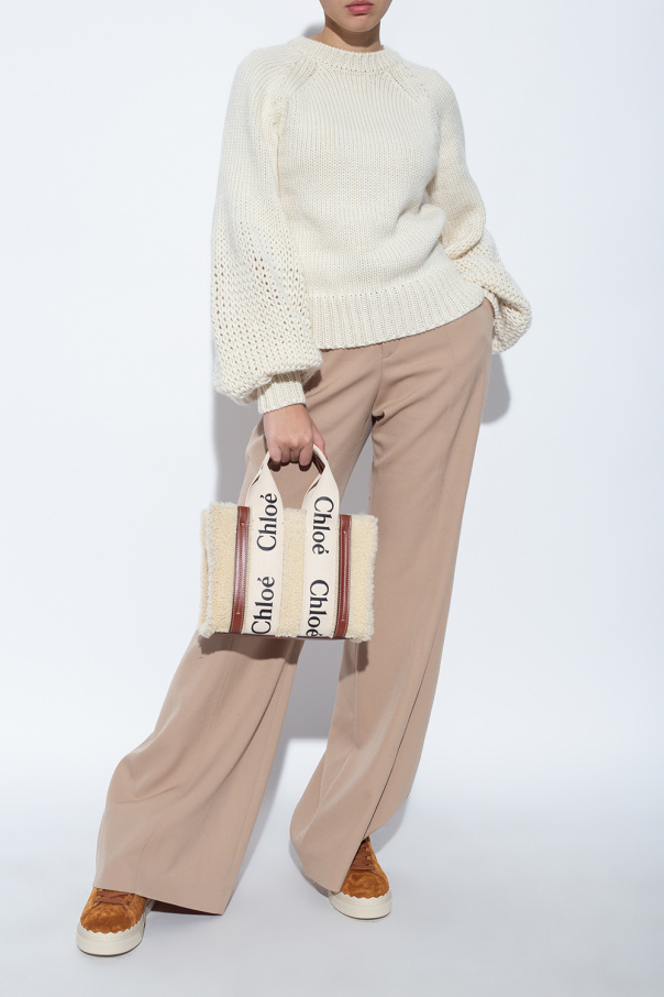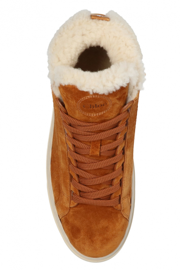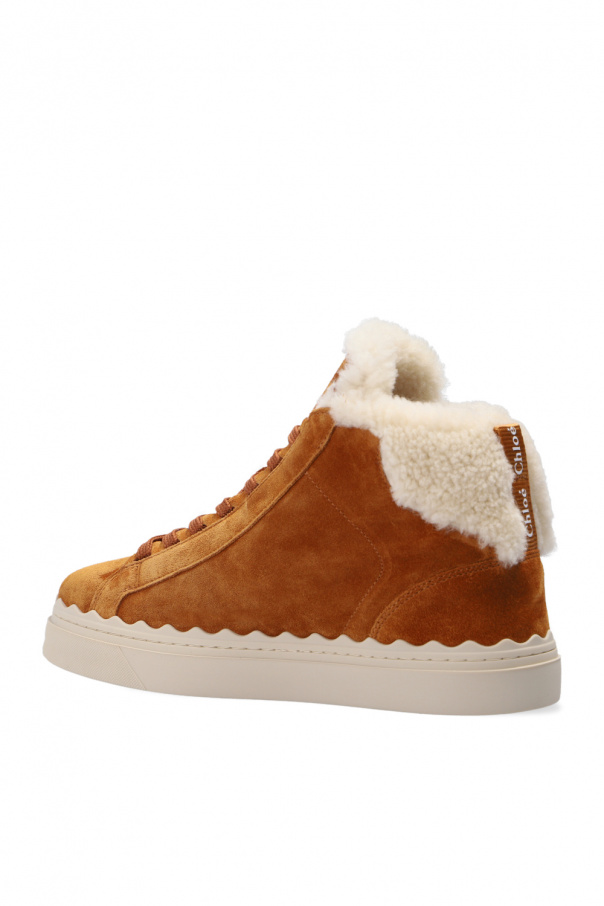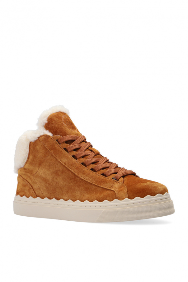 Brown ‘Lauren’ sneakers from Chloé. Crafted from suede, this lace-up model sits on a cream rubber sole and showcases cream lamb fur trims, an embossed logo and a white logo print.