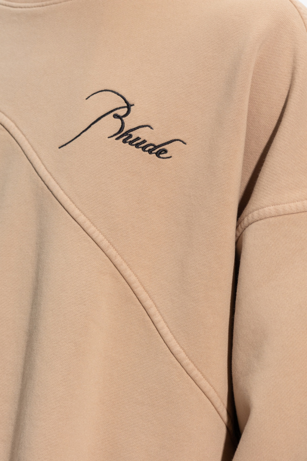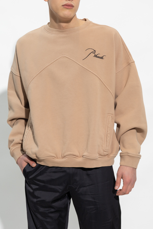 Beige crewneck sweatshirt from Rhude. Crafted from cotton jersey, this style showcases an embroidered black logo, two frontal pockets and ribbed trims on the bottom hem and cuffs.