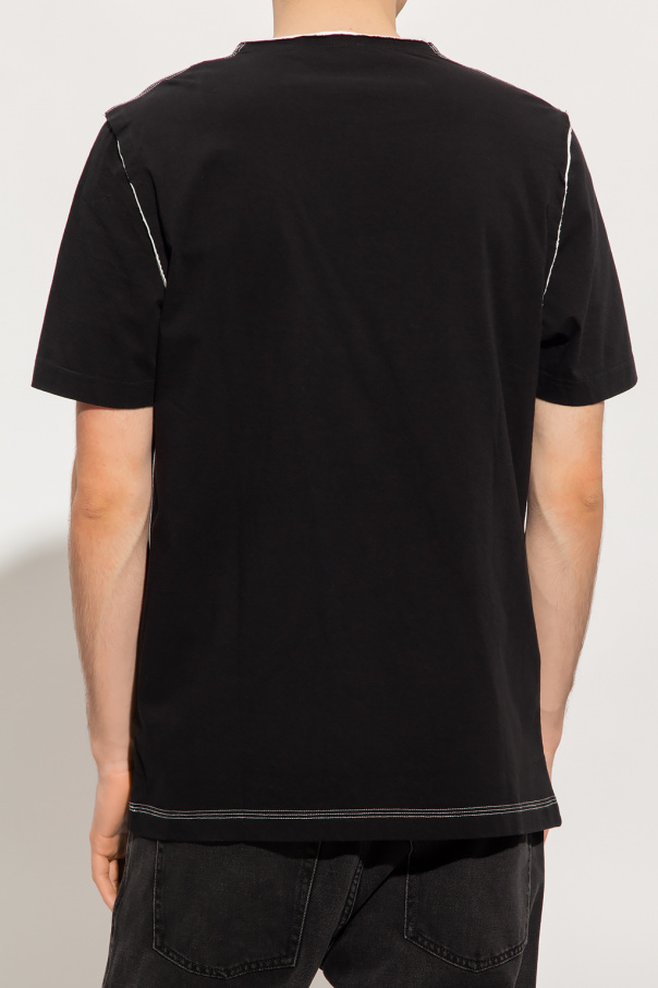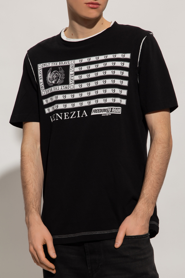 Black ‘T-Rolland’ crewneck T-shirt from Diesel. Made of cotton, this style features a raw-trimmed collar and cuffs and a white graphic print with a winged lion of St Mark—a symbol of Venice.