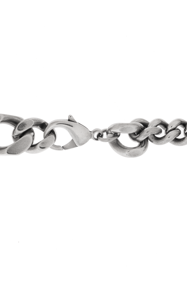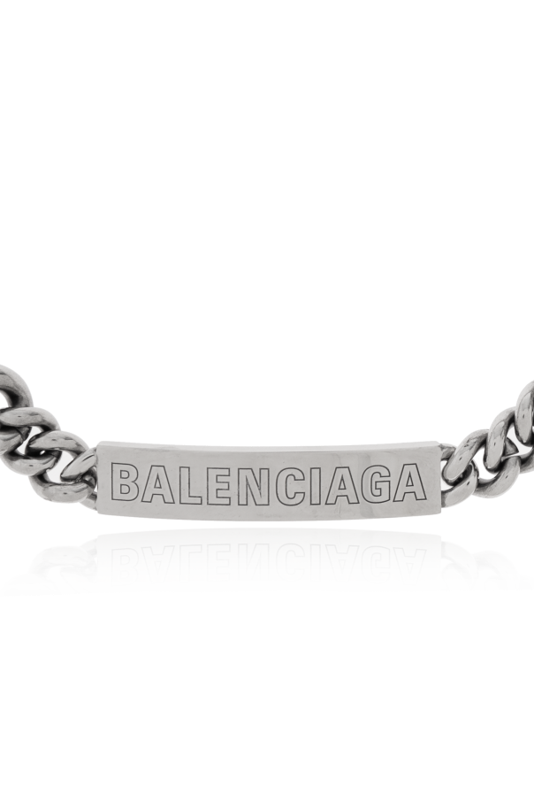 Introducing the Brass Necklace with Engraved Logo by the illustrious house of Balenciaga. This opulent piece features a robust chain design with large links, centered by a striking rectangular plaque elegantly engraved with the iconic \"BALENCIAGA\" logo. Crafted from premium brass in an exquisite silver hue, this necklace exudes a sophisticated and modern allure. The plaque serves as a bold statement of the brand\'s distinctive style, while the sturdy metal clasp, designed in a secure lobster-claw fashion, ensures both functionality and finesse. The necklace stands as a testament to Balenciaga\'s rich heritage and visionary craftsmanship, seamlessly blending timeless elegance with contemporary flair. Perfect for elevating any ensemble to a level of unparalleled exclusivity. Why Choose This Product? Distinctive design with engraved logo for a statement look. Crafted from high-quality silver-toned brass for durability and elegance. Secure lobster-claw clasp adds both style and functionality. Embodies the legacy of Balenciaga, a house synonymous with haute couture excellence.