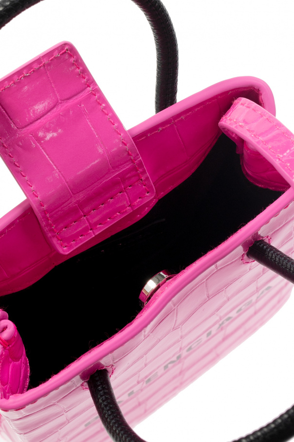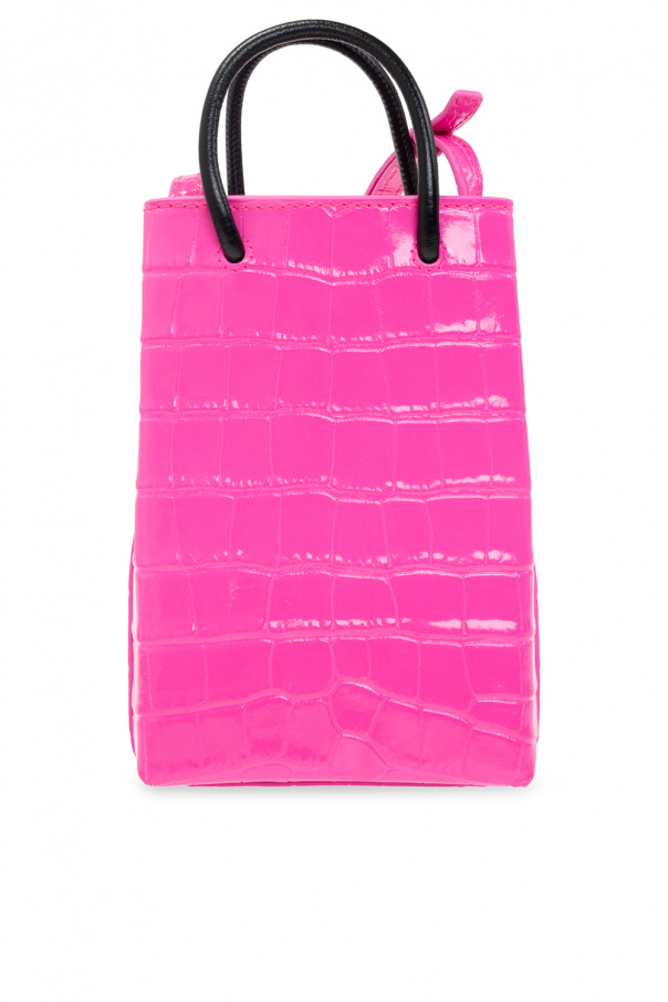 Neon pink ‘Shopping’ phone holder from Balenciaga. Crafted from calf leather with a crocodile skin effect, this item secures with a snap and features a white graphic logo print on the front, two half-round handles in black, an adjustable shoulder strap, silver-tone metal hardware and one internal compartment with a slip pocket.