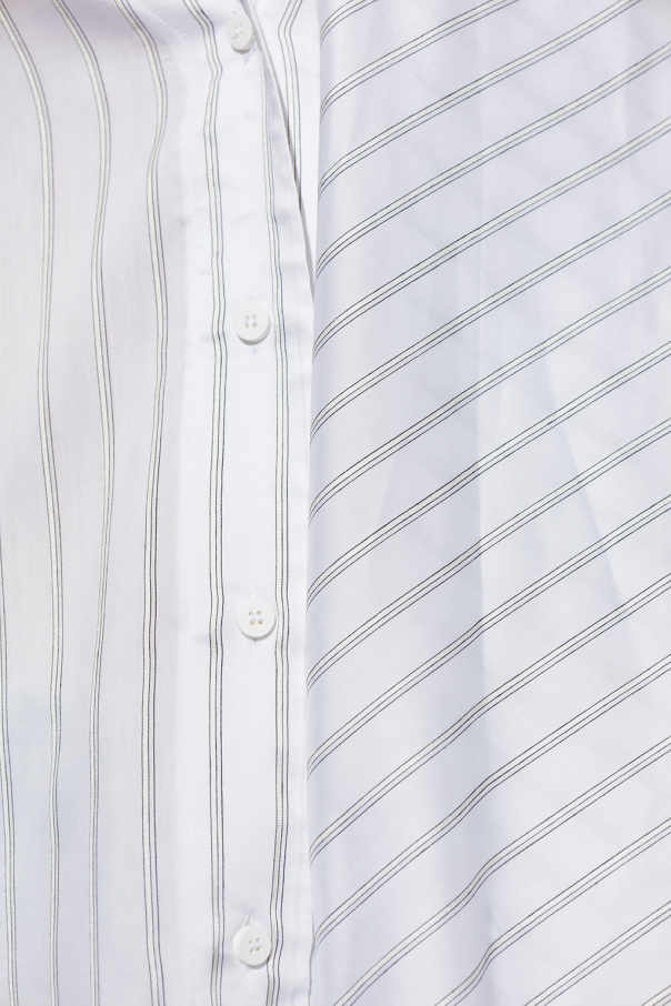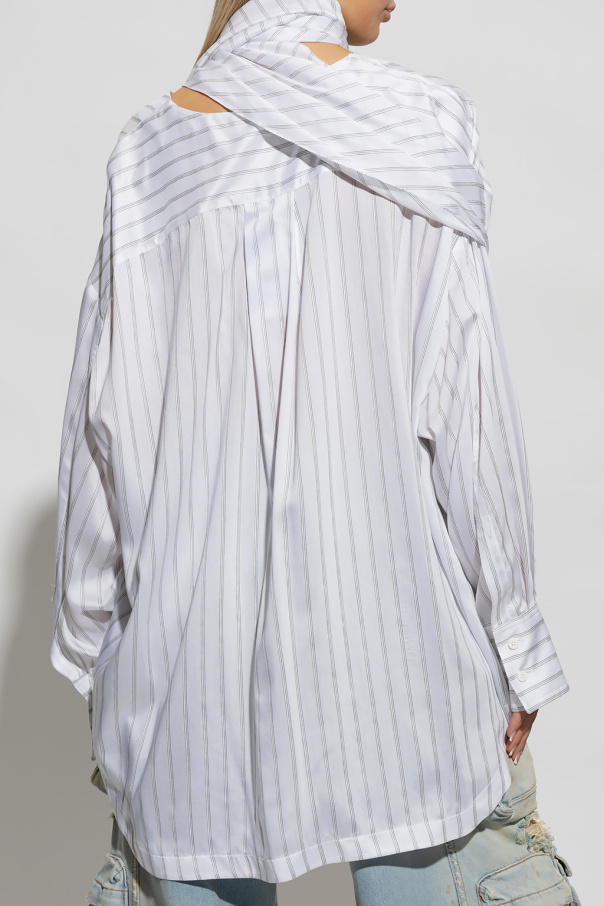 White ‘Bonnie’ oversize shirt from The Attico. Crafted from a viscose and silk blend, this design features a stripe pattern, decorative scarf, V-neck, contrasting logo embroidery in red and long sleeves with buttoned cuffs.