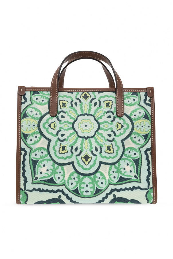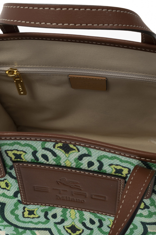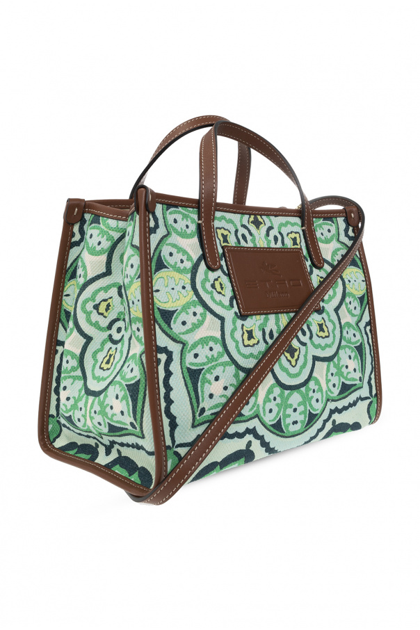 Green and brown ‘Globetrotter Small’ shopper bag from Etro. Crafted from cotton and trimmed with leather, this design showcases the brand\'s signature colourful paisley pattern. It is complete with a logo-embossed leather patch on the front, two half-round handles, a detachable and adjustable shoulder strap, gold-tone metal hardware and one internal compartment with a zip pocket.