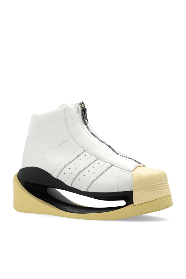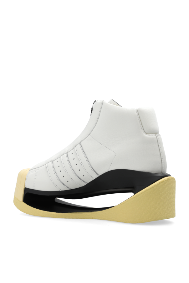 White ‘Gendo Pro Model’ high-top sneakers from Y-3 Yohji Yamamoto. Made of smooth leather, this pair sits on a cream and black rubber sole with a decorative cut-out and features a zip fastening, logo detail, the brand’s signature three stripes and a round toe with a rubber cap in cream.