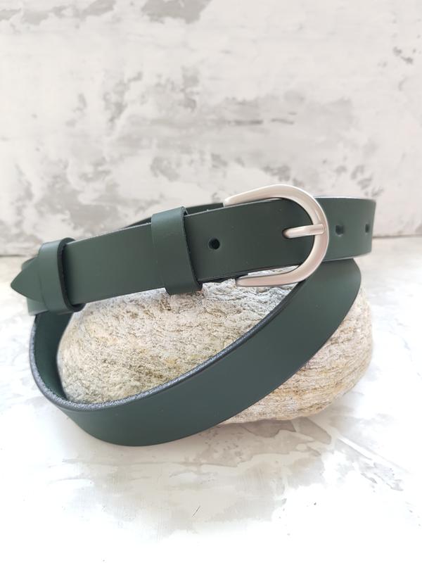 Жіночий ремінь виготовлений із натуральної шкіри високої якості. Власне виробництво ременів понад 20 років, якість та гарантія. Ширина ременя 3,0 см. Металева пряжка матова срібного кольору. Шкіра зеленого кольору. Ремінь ідеально підійде під джинси та сукню. Можна урізноманітнити свій стиль із цим модним аксесуаром. Вкажіть довжину ременя в замовленні, як на останньому фото, щоб ви не скорочували самі.