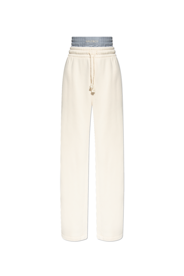 Cream sweatpants from HALFBOY. Crafted from cotton, this pair features double trimming at the waist with a logo embroidery, check pattern and elastic drawstring waistband, as well as two slip pockets and loose-fitting legs.