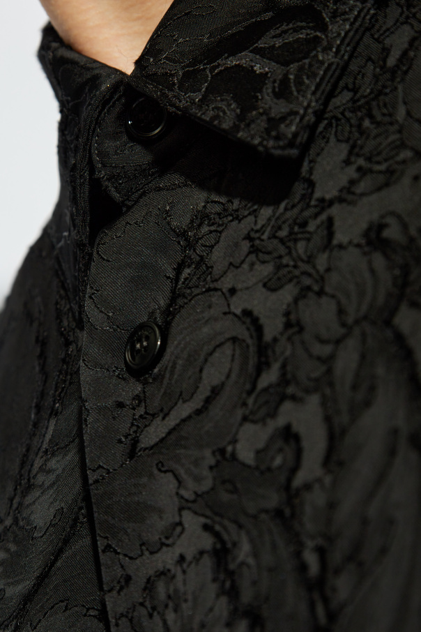 Introducing an exquisite addition to the connoisseur\'s wardrobe: the Versace Barocco Polo Shirt. This piece is a testament to the timeless elegance of black, enhanced by the opulent and intricate baroque patterns that adorn its entirety. Crafted from premium 100% viscose, the shirt boasts a structural integrity with a subtle sheen that introduces an extra layer of sophistication. The classic polo silhouette, with its long sleeves and distinctive collar, is reimagined through the lens of luxury, making it a versatile piece for both formal and casual ensembles. Attention to detail is evident in the meticulously designed cuffs and collar, demonstrating the hallmark of renowned designers\' commitment to excellence. The buttons, seamlessly matching the shirt\'s overall hue, ensure a cohesive look that allows the baroque motifs to captivate and intrigue. Devoid of any overt branding, this garment allows its quality and design to speak volumes, embodying Versace\'s philosophy of understated elegance. The Barocco Polo Shirt is not just an item of clothing; it\'s a piece of art that elevates the everyday. Why Buy This Product? Exemplary craftsmanship from the iconic Versace brand. Luxurious 100% viscose material, offering both comfort and style. Unique baroque pattern, making it a standout piece in any collection. Subtle design elements like color-matched buttons for a refined look. Versatility in styling, suitable for various occasions.
