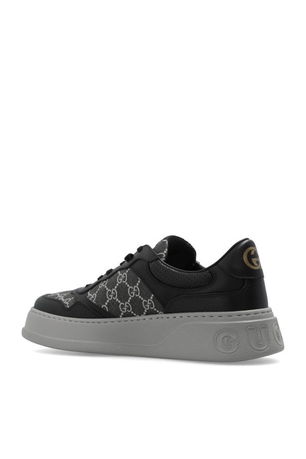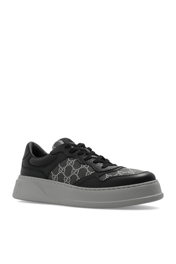 Black and grey sneakers from Gucci. Made from leather and fabric, this lace-up pair features a GG monogram pattern and a grey rubber sole.