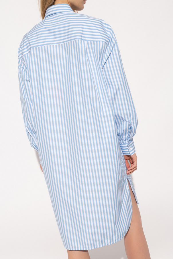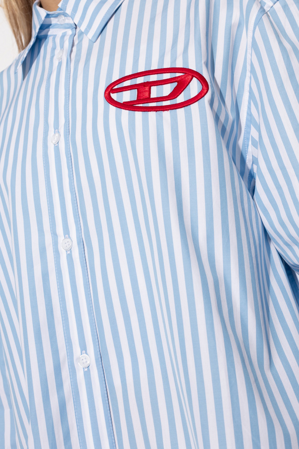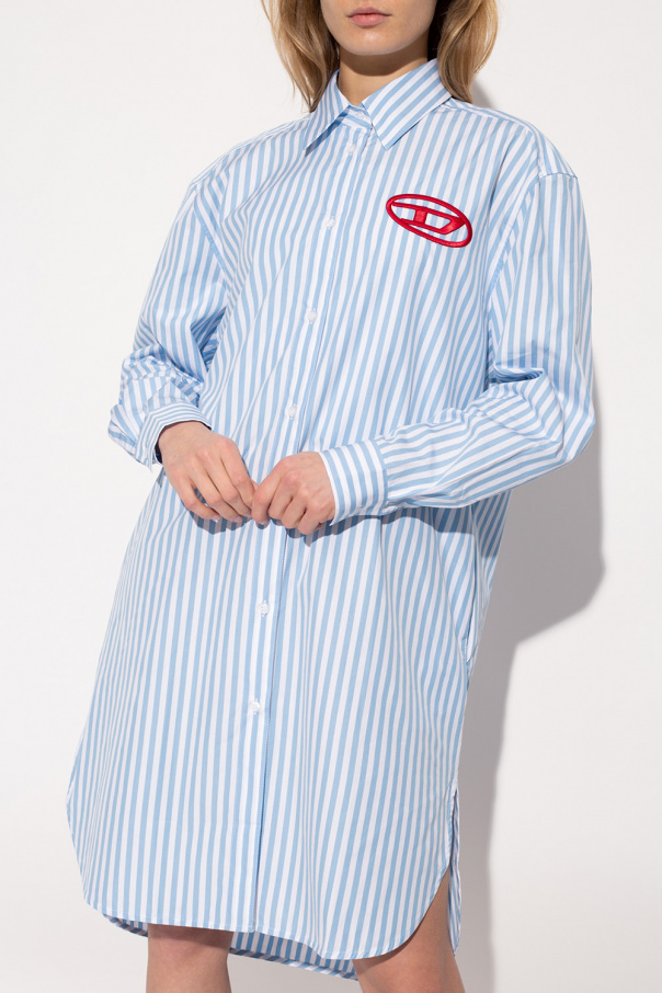 Blue and white ‘D-Lunar’ dress from Diesel. Made of cotton with an asymmetrical silhouette, this style showcases a stripe pattern and a red 3D effect logo embroidered on the chest. It is complete with button fastenings, two side seam pockets and long sleeves with button cuffs.