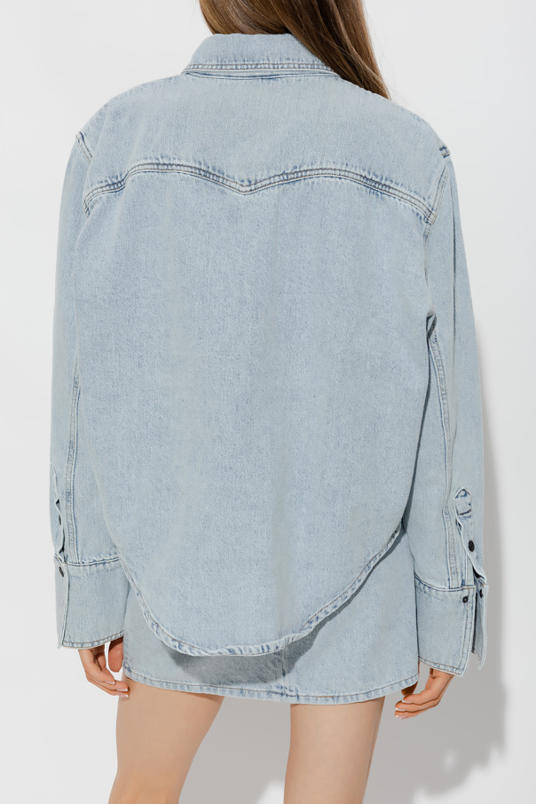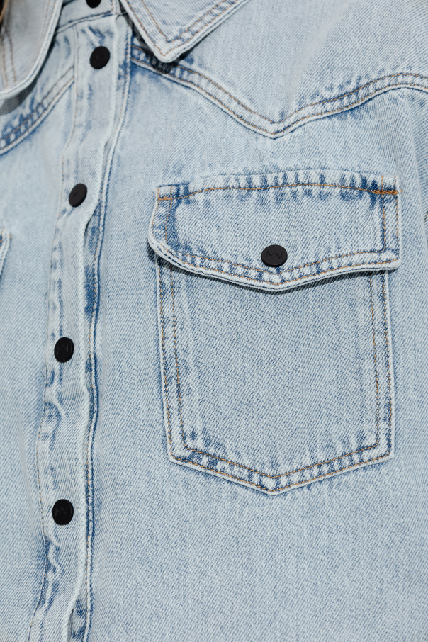 Light blue ‘Erskine’ denim shirt from The Mannei. Fastened with black buttons with the brand\'s logo, this style features two flapped pockets with snaps and long sleeves with snap-fastened cuffs.