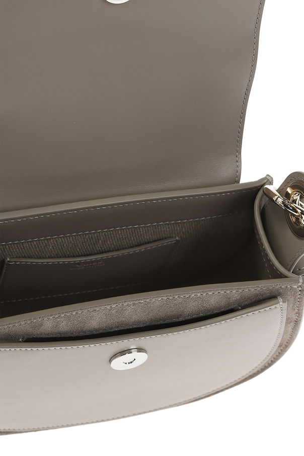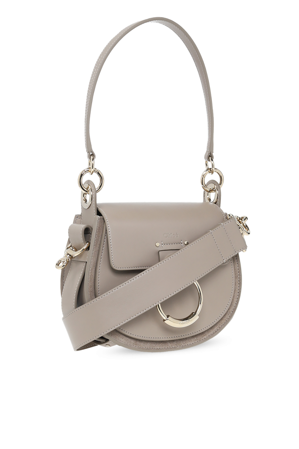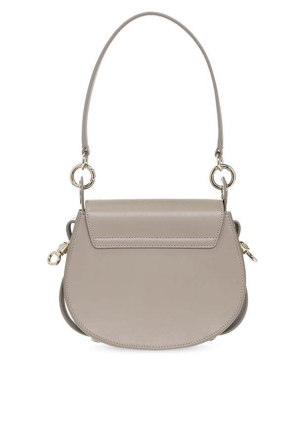 Grey ‘Tess Small’ shoulder bag from Chloé. Crafted from calf leather, this design secures with a decorative snap with a round charm and features an embossed logo, a detachable half-round handle, a detachable and adjustable shoulder strap, silver-tone metal hardware and a beige and brown clad interior with one compartment and one slip pocket.