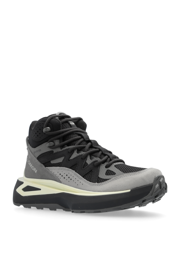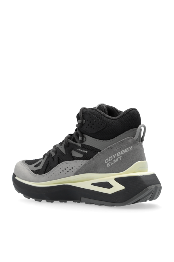 Introducing the ‘ODYSSEY ELMT MID GTX’, a pinnacle of outdoor footwear innovation by Salomon. These ankle-high athletic shoes stand out with their striking black hue complemented by subtle gray and beige accents, and a distinctive white sole with a hint of yellow, manifesting a blend of elegance and resilience. Crafted with a durable combination of leather, synthetic materials, and fabric for the outer layer, and a comfortable fabric inner lining, these shoes are designed to withstand diverse weather conditions, thanks to their potential GORE-TEX technology integration for waterproof and breathable performance. The robust rubber sole features a pronounced pattern, suggesting superior anti-slip properties, essential for outdoor and trekking activities. The shoes boast high ankle support, perforated details on the side panels for ventilation, a conspicuous brand logo, and a traditional lacing system with metal hooks for an optimal fit. The model name \"ODYSSEY ELMT\" is prominently displayed on the tongue, highlighting its exclusivity. Why Purchase the ‘ODYSSEY ELMT MID GTX’? Exquisite blend of high-quality materials for durability and comfort. Advanced features suitable for outdoor activities, including potential GORE-TEX technology for all-weather use. Unique design with superior ankle support and ventilation details. Anti-slip sole pattern for enhanced safety on varied terrains. Elegant aesthetics with a refined color palette and exclusive branding details.
