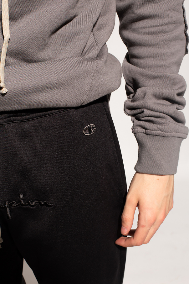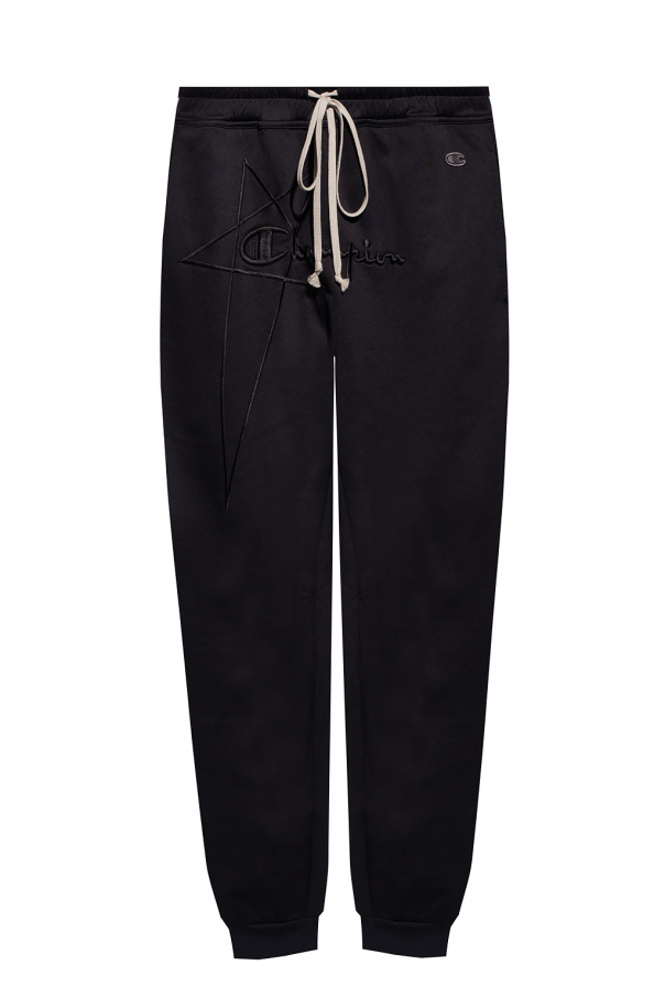 Black sweatpants from Rick Owens x Champion. Falling down with tapered legs, this pair features long drawstrings on the waist, an embroidered logo, two side seam pockets and two back welt pockets.