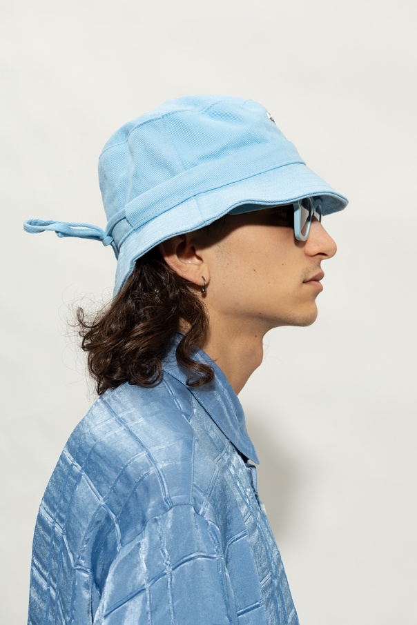 Blue ‘Gadjo’ bucket hat from Jacquemus. Crafted from cotton, this item features a silver-tone metal logo plaque on the front and a drawstring fastening at the back.