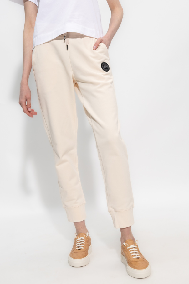 Cream ‘Muskoka’ sweatpants from Canada Goose. Made of cotton, this pair features an elastic drawstring wiastband, logo patch, two slip pockets and ribbed cuffs.