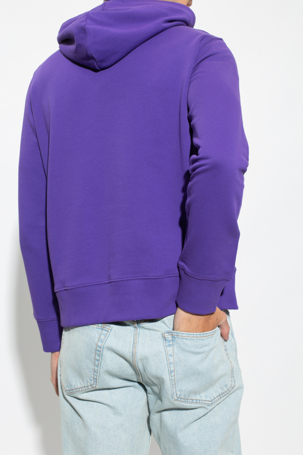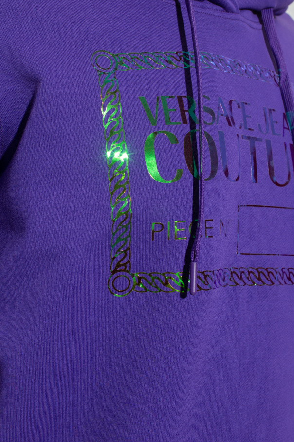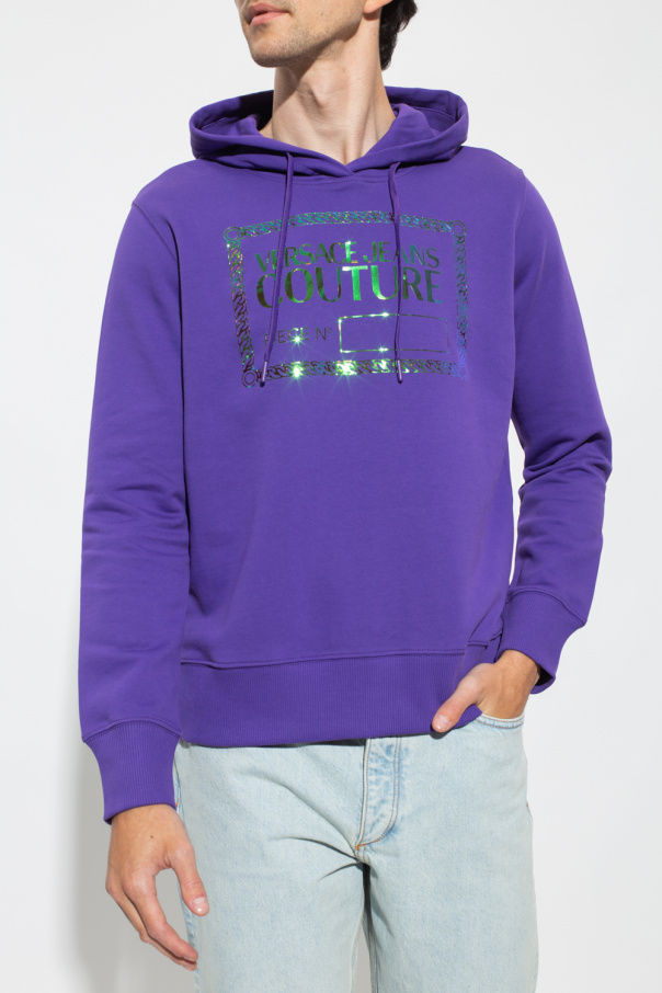 Purple sweatshirt with a drawcord-adjustable hood from Versace Jeans Couture. Crafted from cotton jersey, this style showcases a greenish blue graphic motif with the brand\'s logo and elasticized trims on the bottom hem and cuffs.