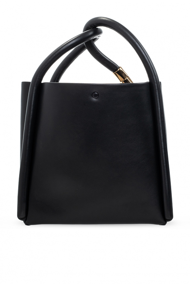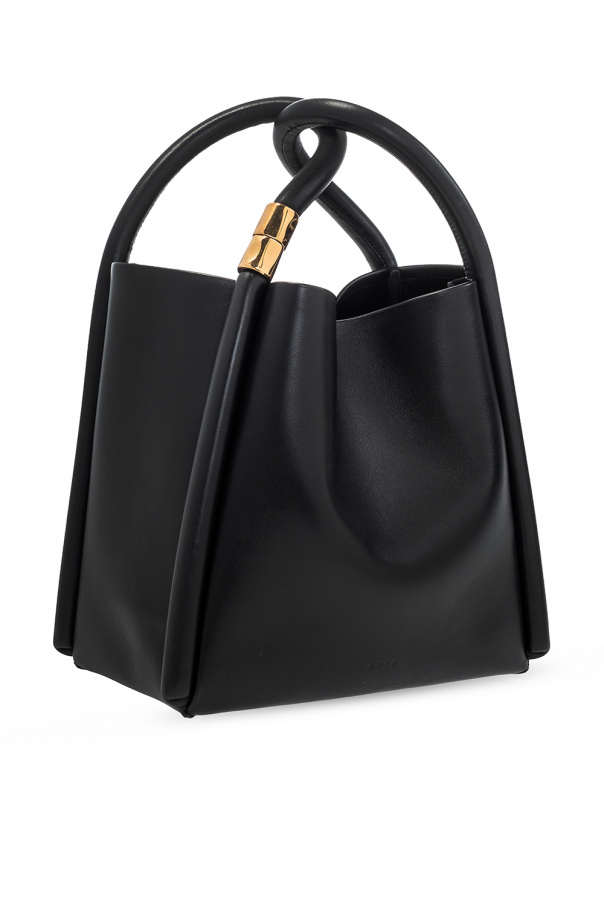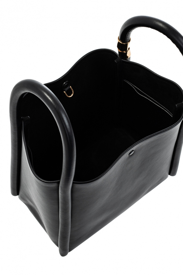 Black ‘Lotus 20’ handbag from Boyy. Crafted from calf leather, this model fastens with a buckle and is enriched by metal elements in gold-tone. It is complete with two half-round handles, detachable and adjustable shoulder strap, gold-tone metal hardware and one internal compartment with brown suede lining and four card slots.