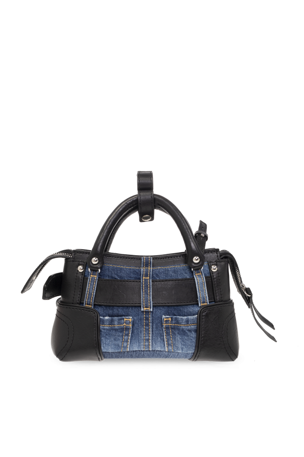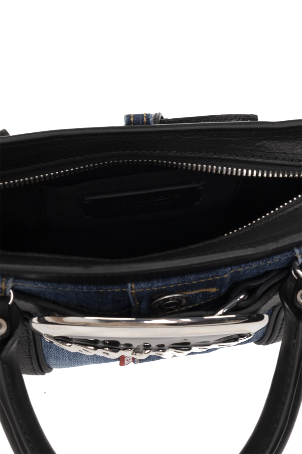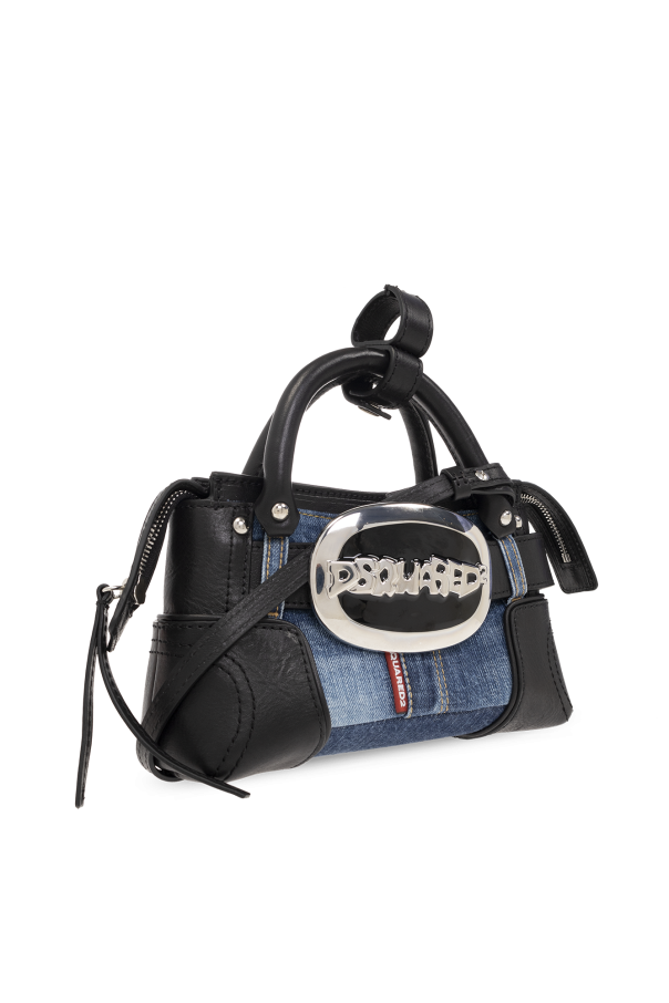 Blue and black shoulder bag from Dsquared2. Made of leather and denim, this design showcases a black and silver-tone metal logo application on the front, two half-round handles, one detachable shoulder strap and one internal compartment with a card slot.