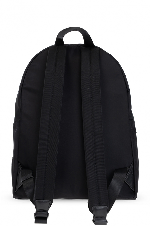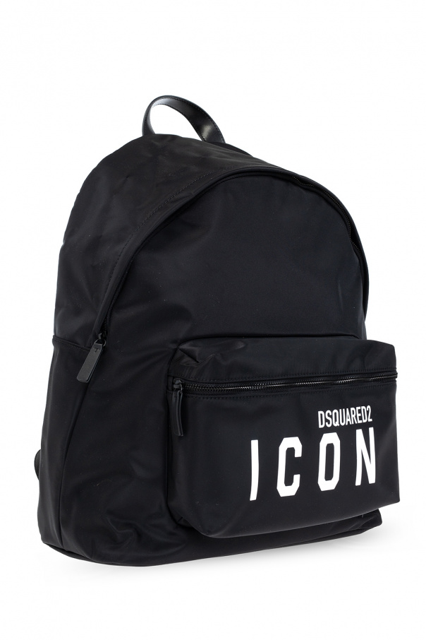 Black ‘Be Icon’ backpack from Dsquared2. Printed with the brand\'s logo in white, this design features a zip fastening, a zipped pocket on the front, a half-round top handle, adjustable shoulder straps and one internal compartment with a zipped pocket.
