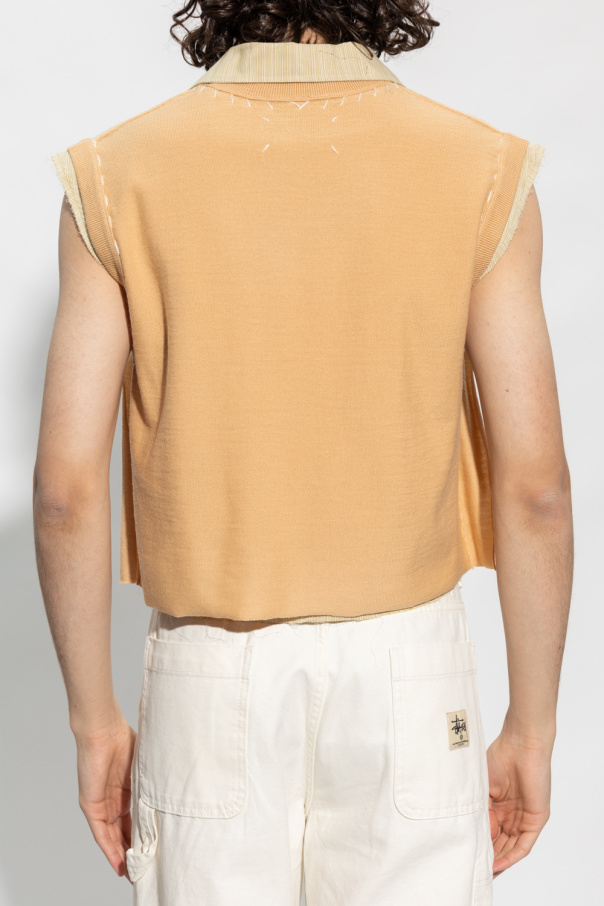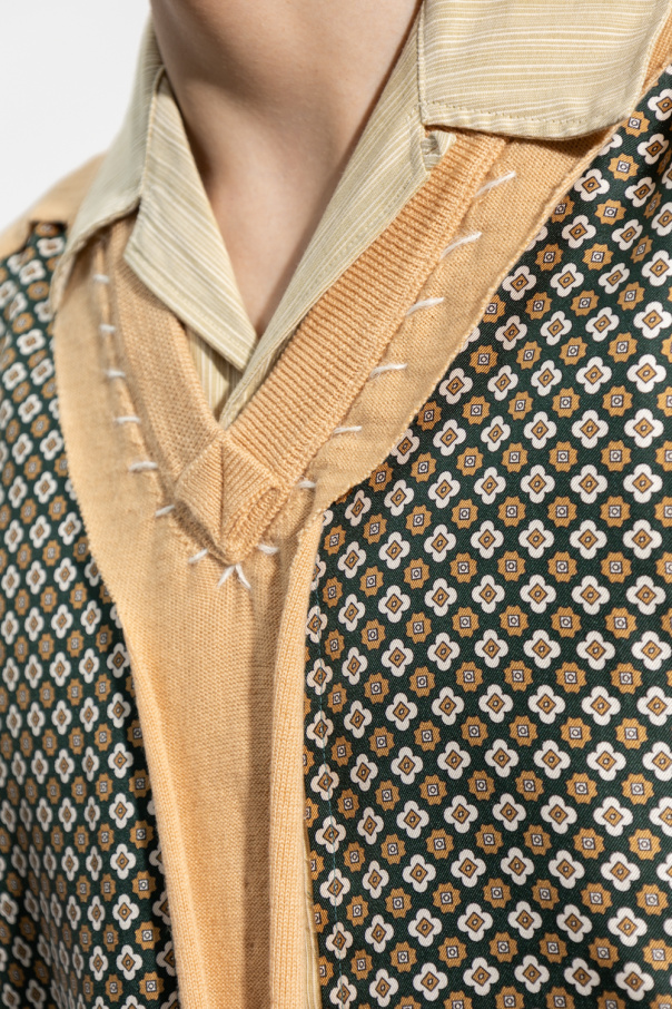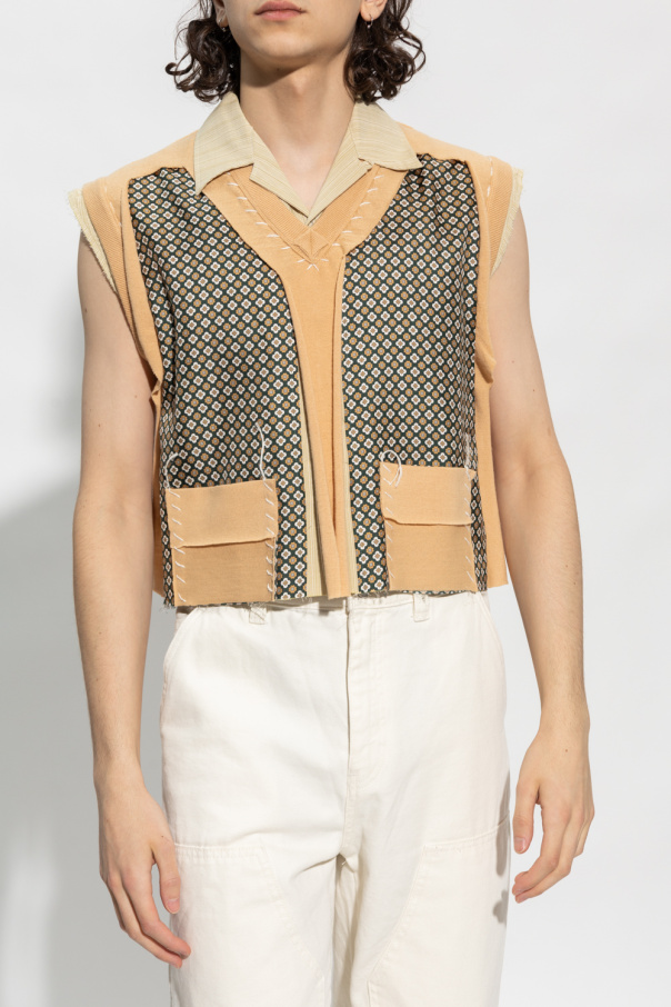 Beige and green sleeveless shirt from Maison Margiela. Crafted from contrasting fabrics including cotton and silk as well as knit trims, this garment is complete with buttons, a pattern, two front pockets and raw cut edges.