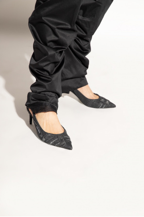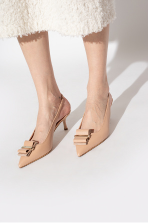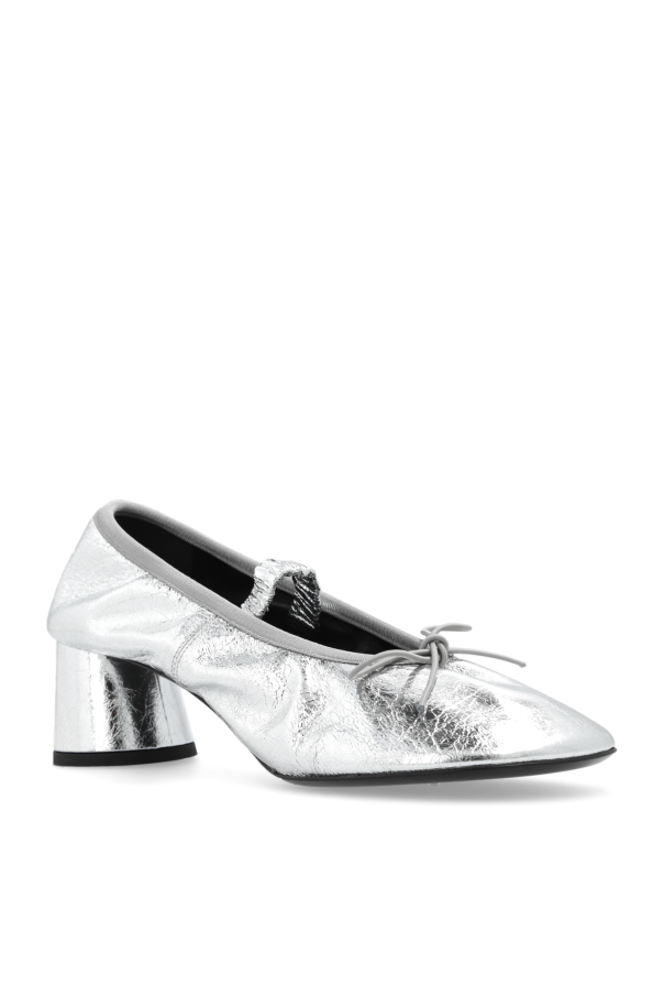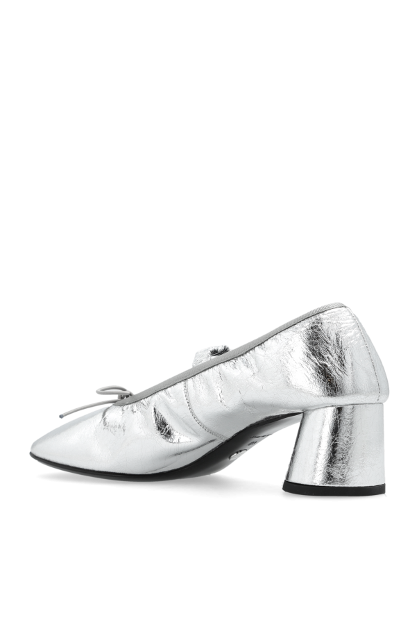 Silver-tone ‘Mary Jane’ pumps from Proenza Schouler. Made of leather with a creased effect, this model sits on a black rubber sole and features a round toe and an elasticized strap accompanied by a decorative bow on the front.