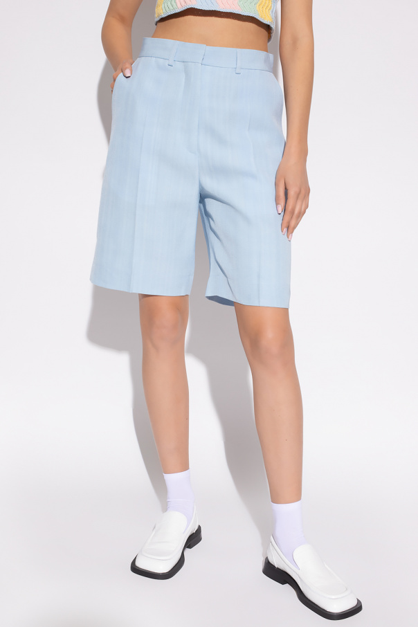 Light blue pleat-front shorts from Casablanca. Crafted from a textured silk blend, this pair features a zip fly with a button and a snap, two side seam pockets and one back slip pocket.