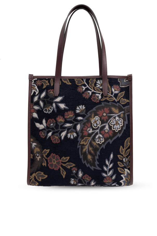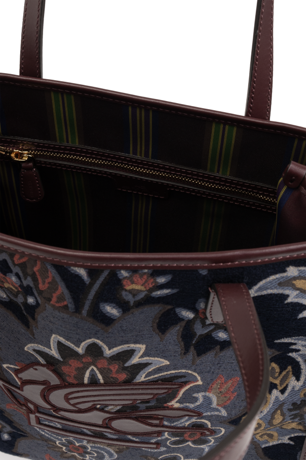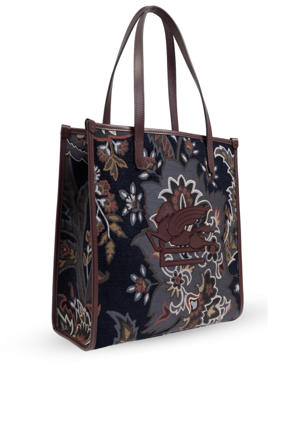 Introducing the exquisite Etro Shopper Bag, a quintessential accessory for the discerning woman. This luxurious bag boasts a classic rectangular silhouette adorned with dual handles, epitomizing the elegance of the shopper style. The bag\'s exterior is graced with a rich, multicolored floral pattern, predominantly in dark shades of navy, indigo, and gray, accentuated by hints of white, red, and beige. Crafted from premium textile materials, the bag features a distinct texture that exudes sophistication. The handles and finishing details are meticulously fashioned from brown leather, adding a touch of refinement and durability. A prominent, embossed brown emblem depicting a winged horse adorns the front, symbolizing the opulence associated with Etro\'s heritage. The interior of the bag is lined with a striped fabric, providing a striking contrast and enhancing its stylish appeal. Functionality is not compromised, as the bag includes a zippered pocket to secure your essentials. Why Choose This Product? Elegant and artistic floral design. High-quality materials with a textured finish. Durable leather handles and details. Spacious interior with a secure zippered pocket. Iconic embossed logo for a touch of luxury.