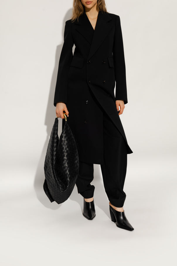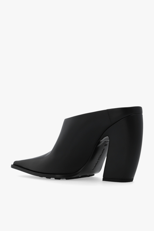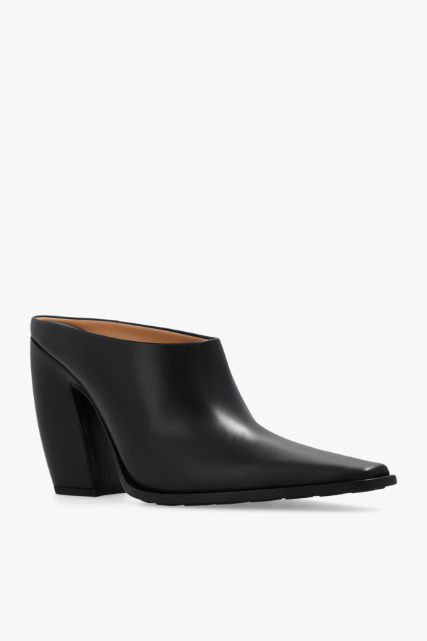 Black ‘Tex’ slip-on mules from Bottega Veneta. Made of leather, this pair features an elongated pointed toe and black rubber-injected leather sole with increased stability.