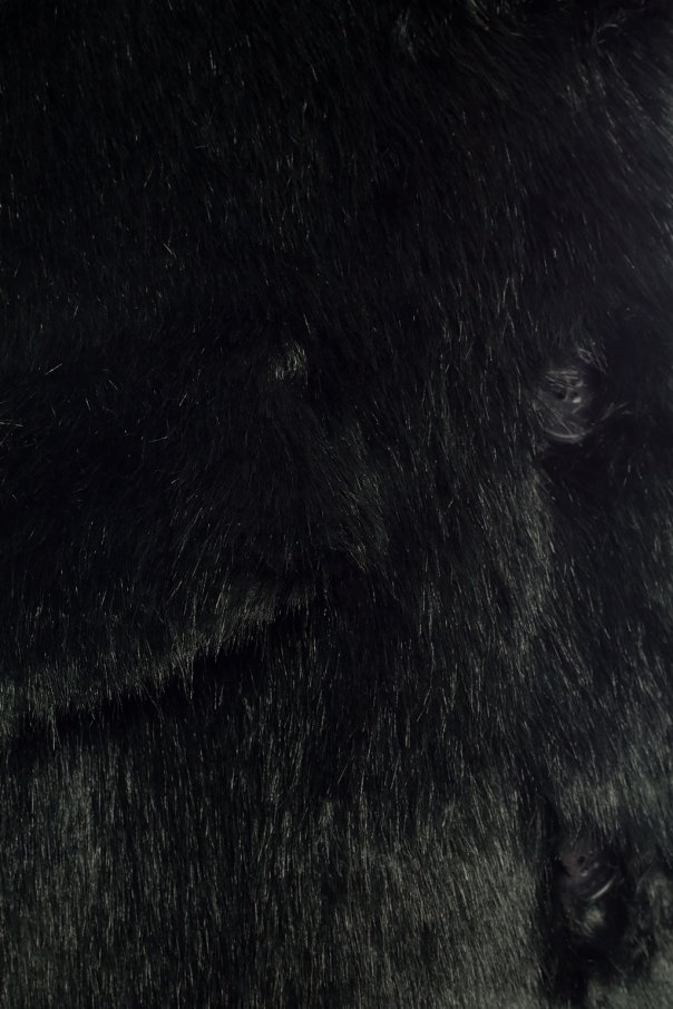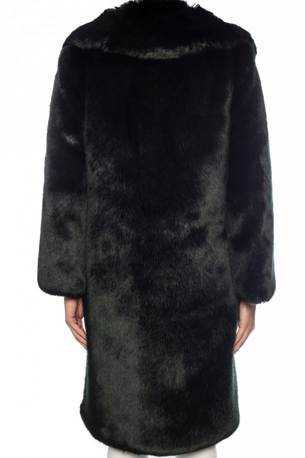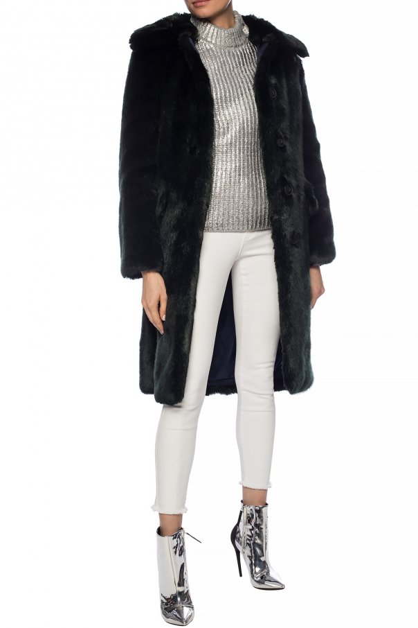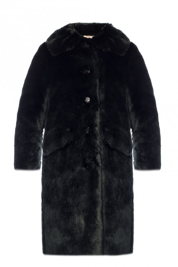 Dark green coat with a collar from Tory Burch. Made of faux fur. Fastened with buttons. Two flap pockets on the front. Long sleeves.
