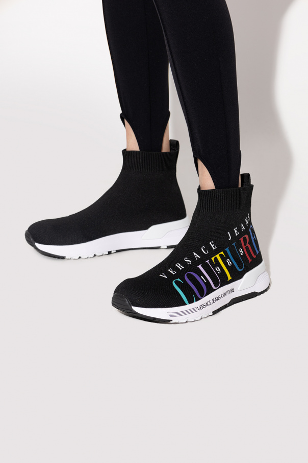 Black sneakers from Versace Jeans Couture. With a sock-like stretchy upper, this model features a colourful logo print and a black and white rubber sole.